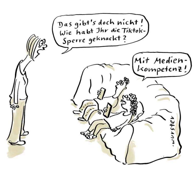 SZ 18. 2. 26 #sozialemedien #kinder #socialmedia #tiktok #medienkompetenz Der Cartoon wurde heute in der Deutschlandfunkkultur-Sendung “Der Tag mit Paulina Fröhlich” zum Social-Media-Verbots-Thema erzählt – Danke für den Tip, liebe Zeichen-Kollegin Teresa Habild !